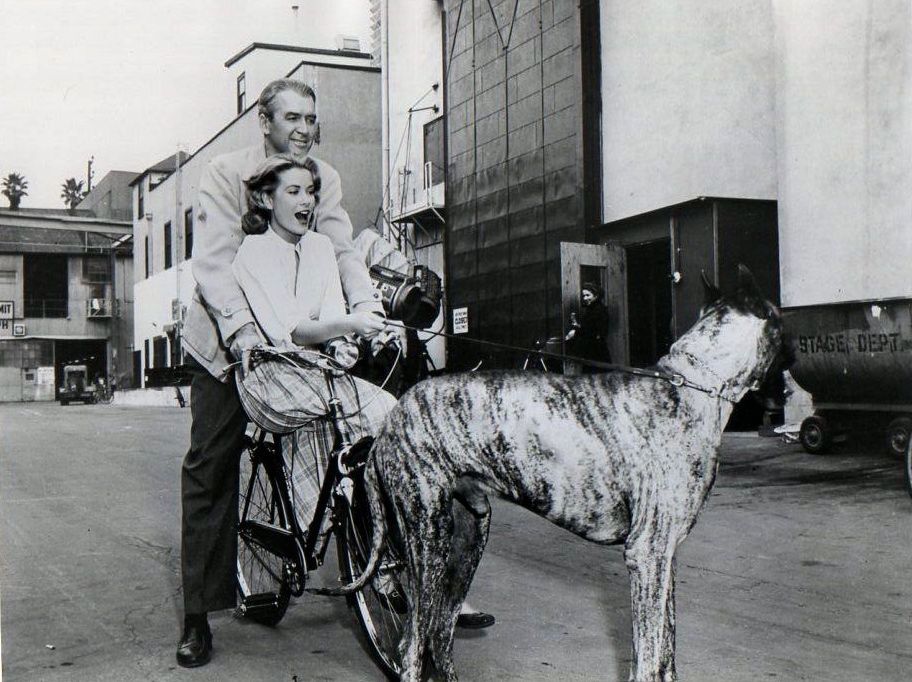 James Stewart and Grace Kelly ride a bike, pulled by Rosemary Clooney’s Great Dane.