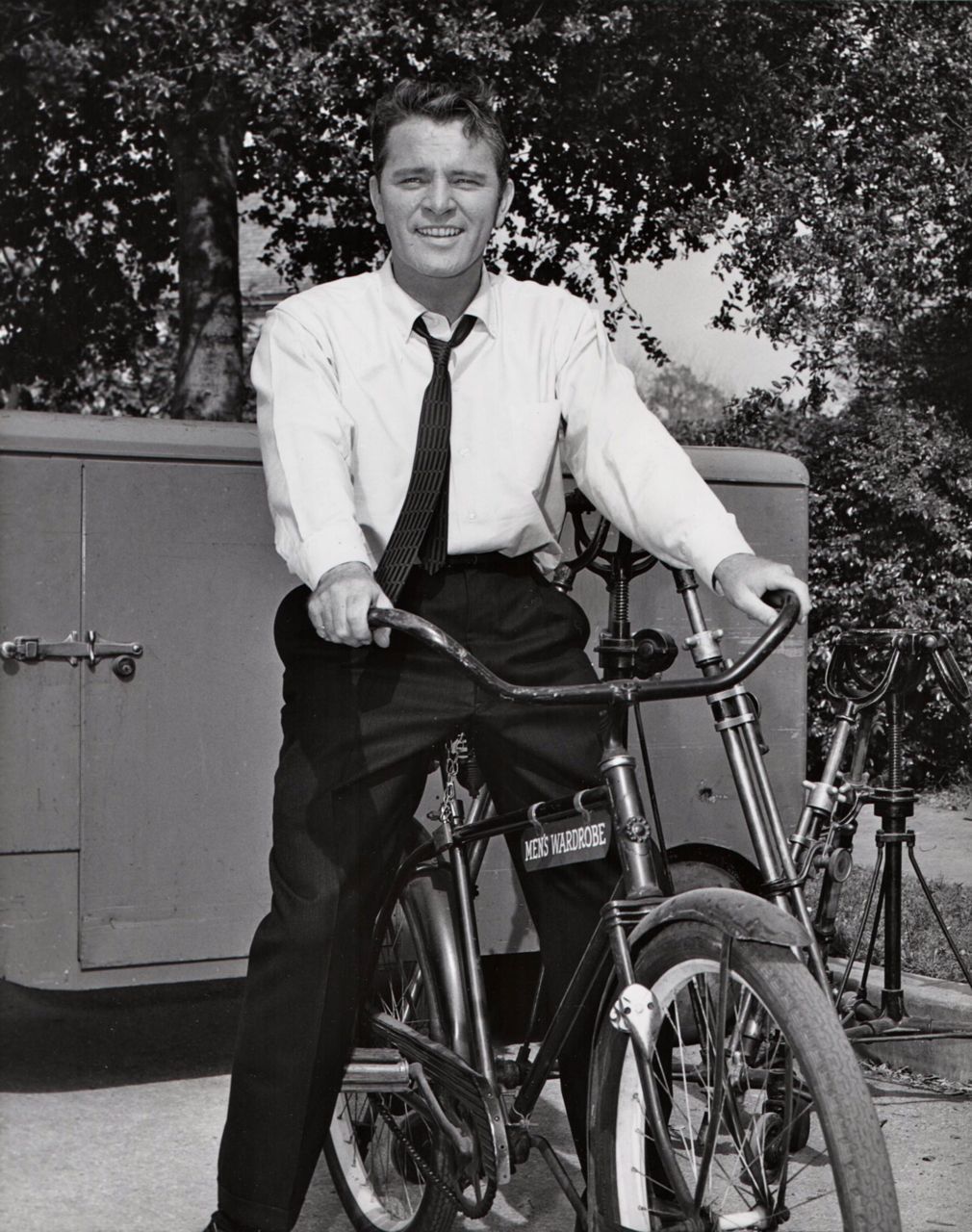 Richard Burton rides a bike, courtesy of Men’s Wardrobe.