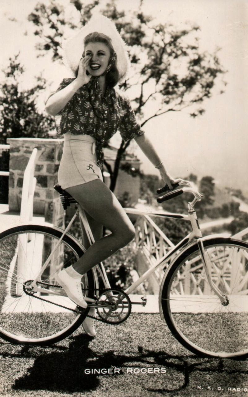 Ginger Rogers rides a bike, wears a hat, gives a shout. An RKO Radio Pictures postcard.
