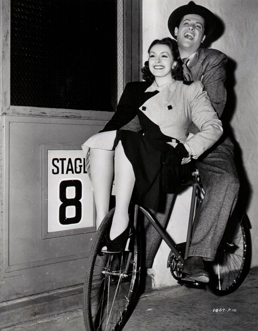 “Well, here’s one way to get to work. Robert Cummings pedals Nancy Kelly to the set of Universal’s "One of the Boston Bullertons,” in which they play the romantic leads.“ — Universal Pictures, 1940