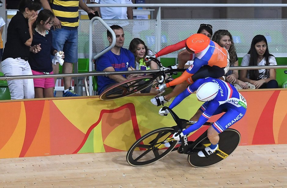 Laurine van Riessen of the Netherlands rides on the barrier wall with Virginie Cueff of France after avoiding a crash during the second heat of the keirin race first round, at the Olympic velodrome in Rio de Janeiro. The Dave Hunt photograph was published in The Guardian’s Sport picture of the day.