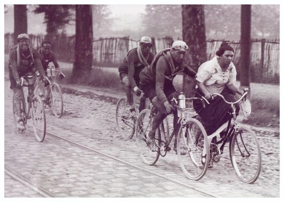During the 1924 Tour de France, in the middle of the 482 km long Les Sables-d’Olonne–Bayonne stage, Hector Tiberghien still finds the strength to provide a helping hand to a young Bordeaux woman. Thanks to Robert’s Flickr stream for this one.