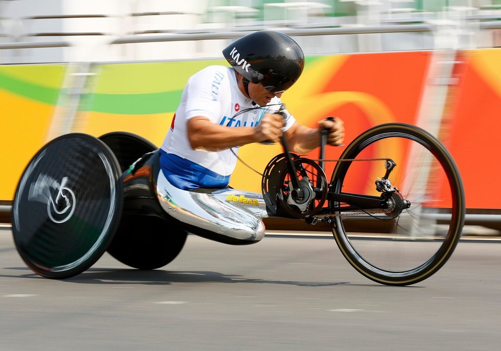 Former F1 and IndyCar driver Alex Zanardi of Italy on his way to winning gold in the men’s cycling time trial – H5 at the Paralympic Games. The Jason Cairnduff photo was published in The Guardian’s look at day 7 of the games.
