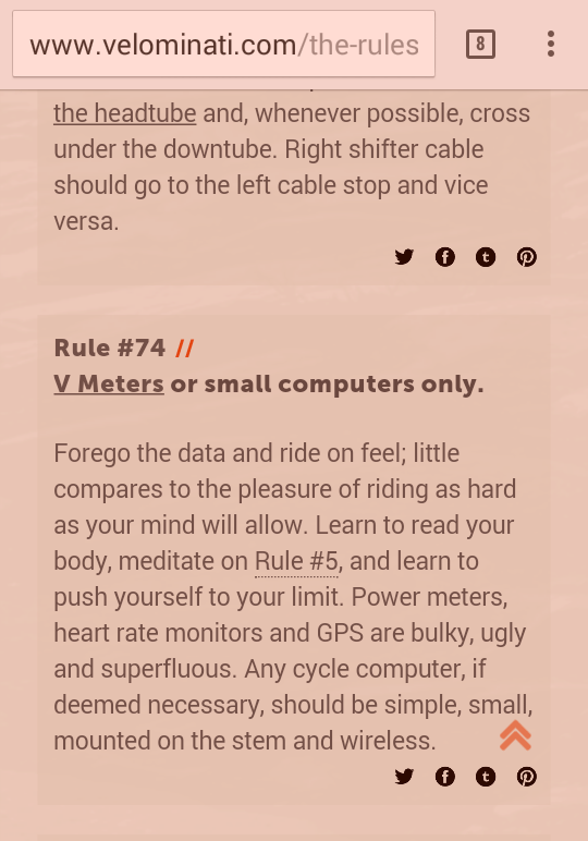 One of the most important rules, in my opinion. Too much data slows you down. Ride by feel. Ride hard, to the limit. That’s my M.O.