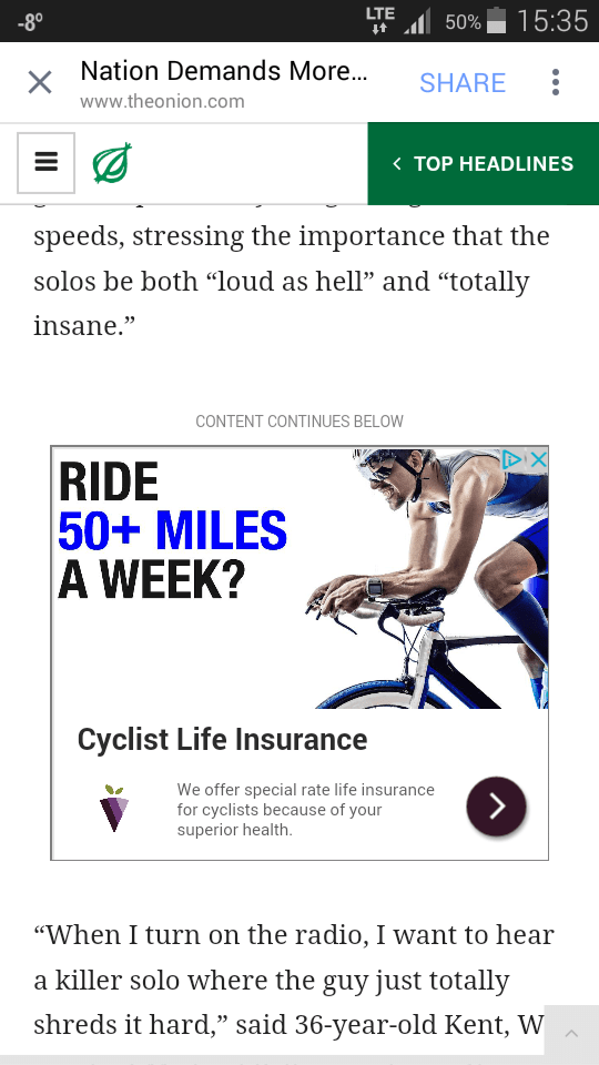 Targeted advertising I received while reading The Onion. Would I pay higher premiums because of my risky behavior or less because of my fitness? I’m just gonna bank on the fact that the driver who takes me out is heavily insured/sued.