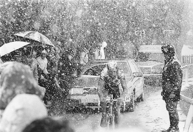 Johan Van de Velde fighting through snow on the Gavia, Giro d’Italia 1988
