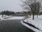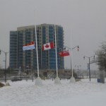 April Showers of freezing rain, sleet, snow and a Nor’Easter howling off of Kempenfelt Bay driving tiny daggers into my face and pointing the Canadian flag opposite its prevailing direction. The husky in Dano loved it. The icy desolation at a normally joyfully bustling Centennial Park is a clear indication that townfolk have hunkered down at home until this Ice-mageddon leaves town. Flags at the end of Victoria Street are halfmast for Humboldt. Dano lifts a leg against a tree, melting some ice; but not fast enough. Did the guy who stickered that sign do so with irony in mind? Two Canada Geese blown upstream stopped only by the solid ice on Dyment Creek. One warm day in May or June we’ll wake up and this April will just be a bad dream that July will hopefully make us forget.