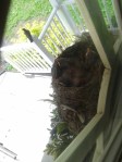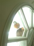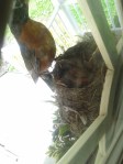 Well, it’s been almost a week since the three Hatchlings emerged from the four eggs in the Front Door Nest. Momma Robin is very protective and we try not to disturb her and her young family too much. Poppa bird has been making appearances, as well, helping to provide food and protection. Curiosity drove me to peel back one window pane’s privacy film from the inside, allowing us to peer unobscured into the Nest. The view is priceless.