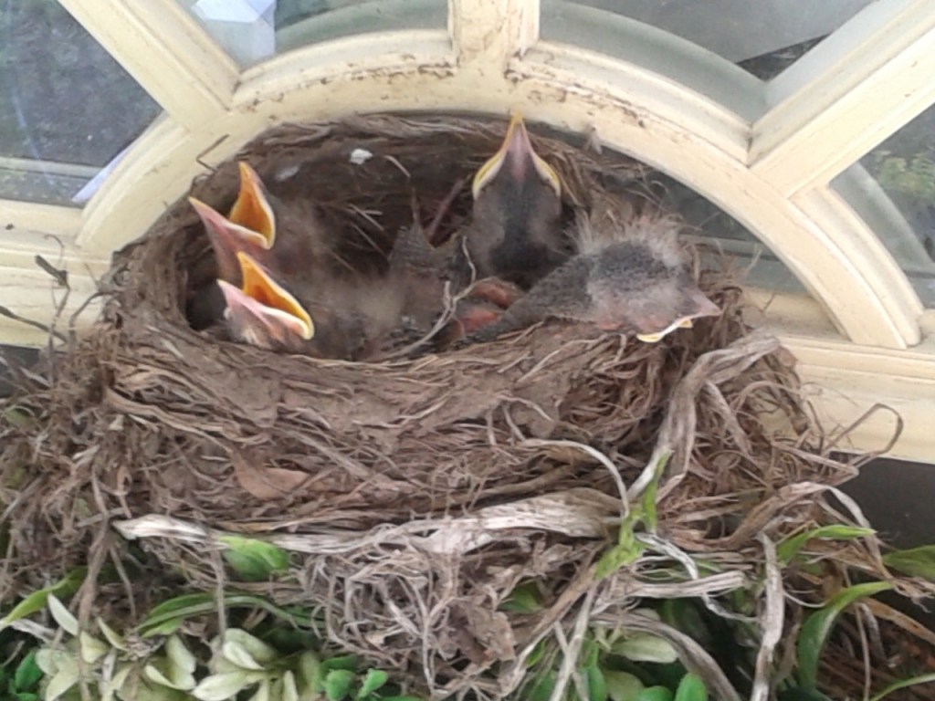 So, I was wrong. There is in fact four young robins who have emerged from the four blue eggs! When I last posted I only saw three beaks straining upwards for nourishment and I assumed on egg did not hatch. After they shuffled around in the tiny nest, a fourth beak appeared from beneath the thin down forming on their shivery pink skin. The nest seems to be getting smaller as these young’uns are so quickly growing. I wonder when they’ll be making a leap towards leaving the nest?