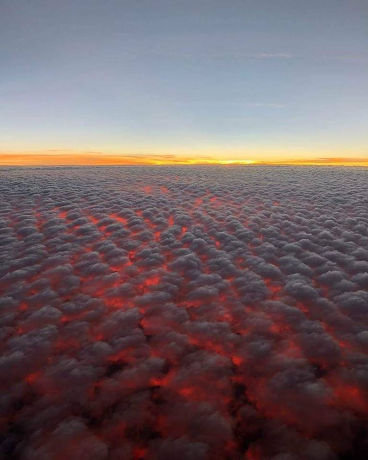 Photo by Michael Ramakrishnan. Altocumulus clouds & a sunset at 30,000 feet amidst California fires.