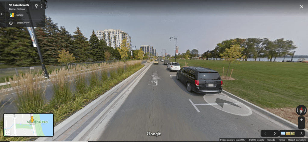 I travel almost daily and in all seasons, usually on foot or bicycle and occasionally in a car, on Lakeshore Drive between Tiffin Street and Simcoe Street where the speed limit is 50 km/hr at all times. This is the narrow one lane (each way, with a divider island in between) section of road that provides access to Barrie’s spectacular Centennial Park and Marina where thousands of people visit daily, especially in the summer months.