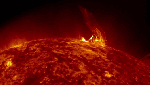 Coronal mass ejections release large quantities of matter and electromagnetic radiation into space above the Sun’s surface, either near the corona (sometimes called a solar prominence), or farther into the planetary system, or beyond (interplanetary CME). The ejected material is a magnetized plasma consisting primarily of electrons and protons. While solar flares are very fast (being electromagnetic radiation), CMEs are relatively slow.