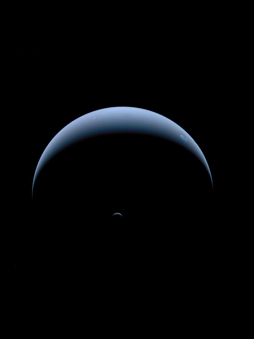 Neptune and triton captured by Voyager 2 on their way out of the solar system in August 1989.