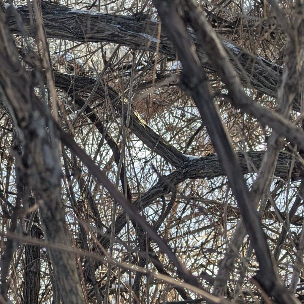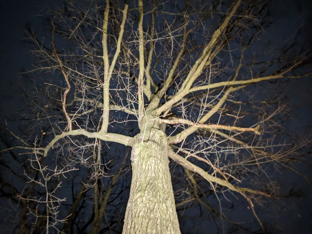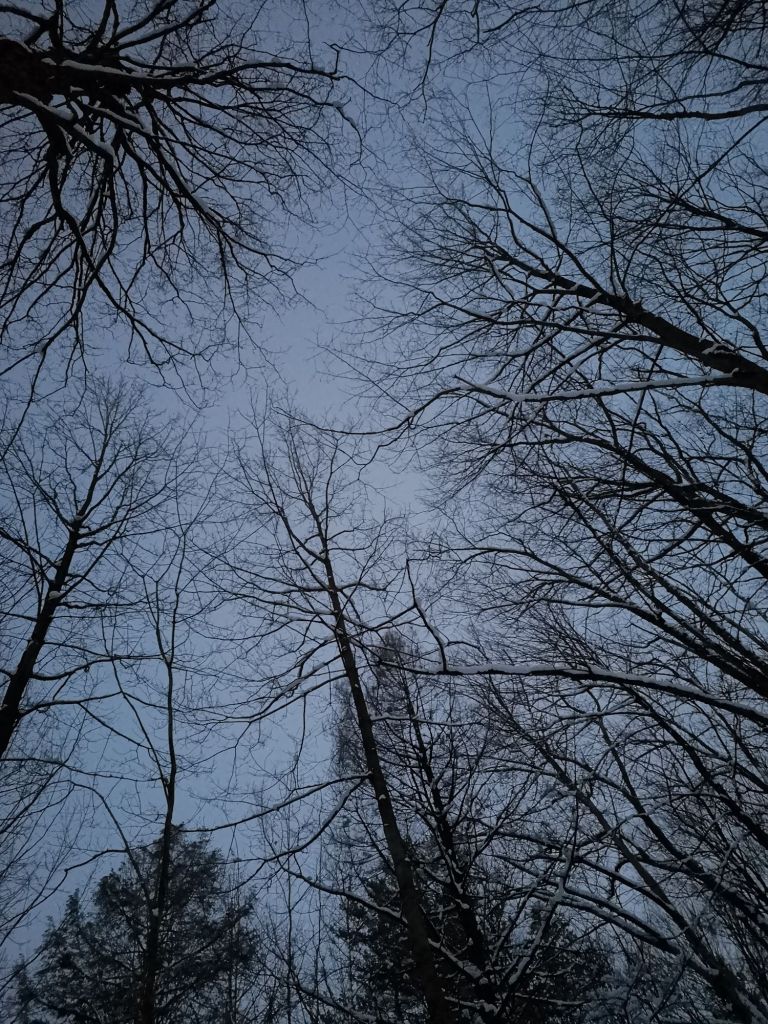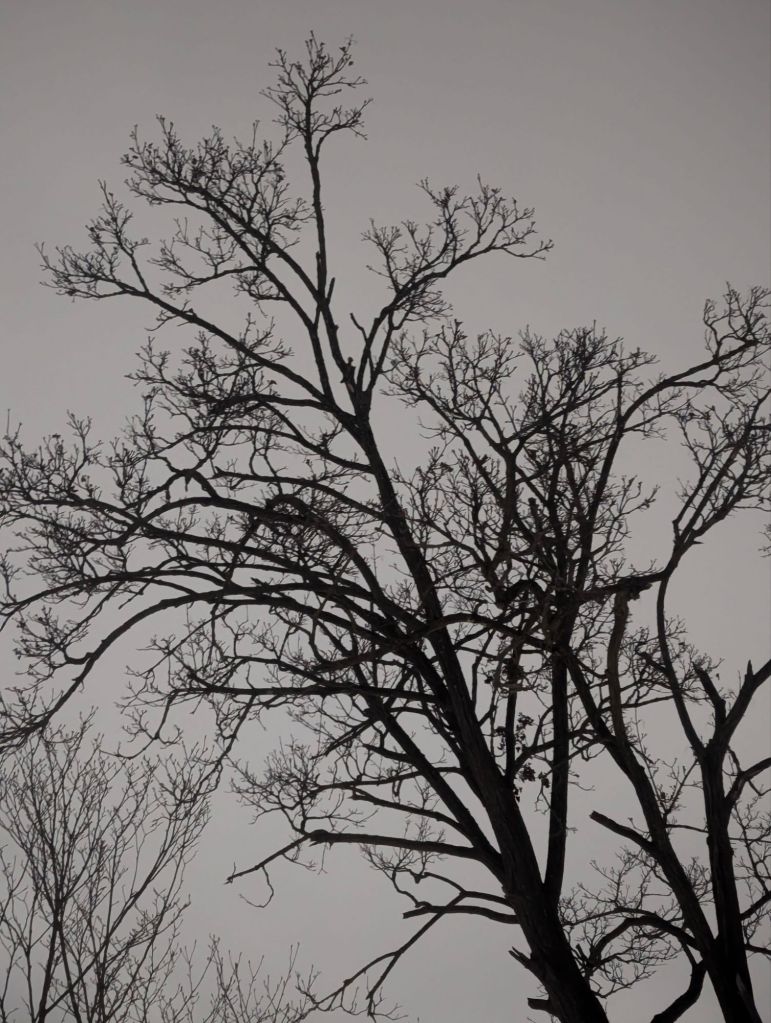 long after the colourful foliage of Fall has dropped from the branches that continue to reach for the grey Winter skies, I can’t help but look up in wonder. I marvel at the stark dendritic patterns that are silhouetted against the dark Winter sky above. often, these gnarly branches house a squirrel’s sanctuary high above the snowy ground in our neighbourhood, or carefully cradle a full Moon that illuminates my Winter walks with Artie. although grey and dark right now, I am encouraged by the promise that before too long, the leaves will Spring forth from these branches to cast a cool shade on the streets below, ushering in the Summer season during which these branches will continue their journey towards the blue sky above