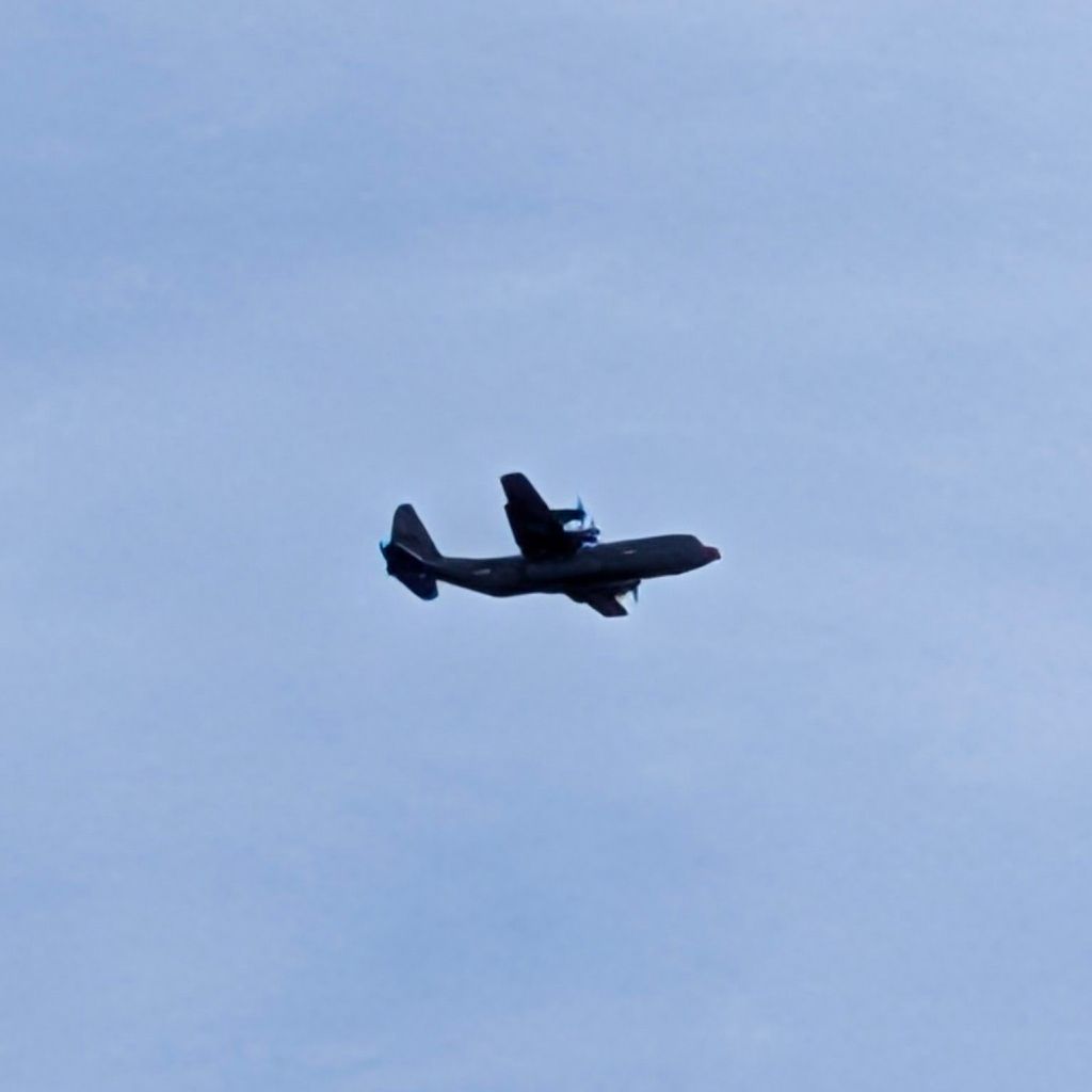 I had lunch today sitting at a picnic table outside our new workplace in Oro-Medonte, enjoying the Sunshine and scuttlebutt with some coworkers. our conversation was interrupted by the lazy rhythmic drone of a Lockheed C-130 Hercules’ big engines. it’s a four-engine turboprop military transport aircraft, that I guess took off from the nearby Lake Simcoe Regional Airport. it was flying so closely overhead that I imagined I could touch it if I reached up towards the blue sky. an impressive sight, most certainly.