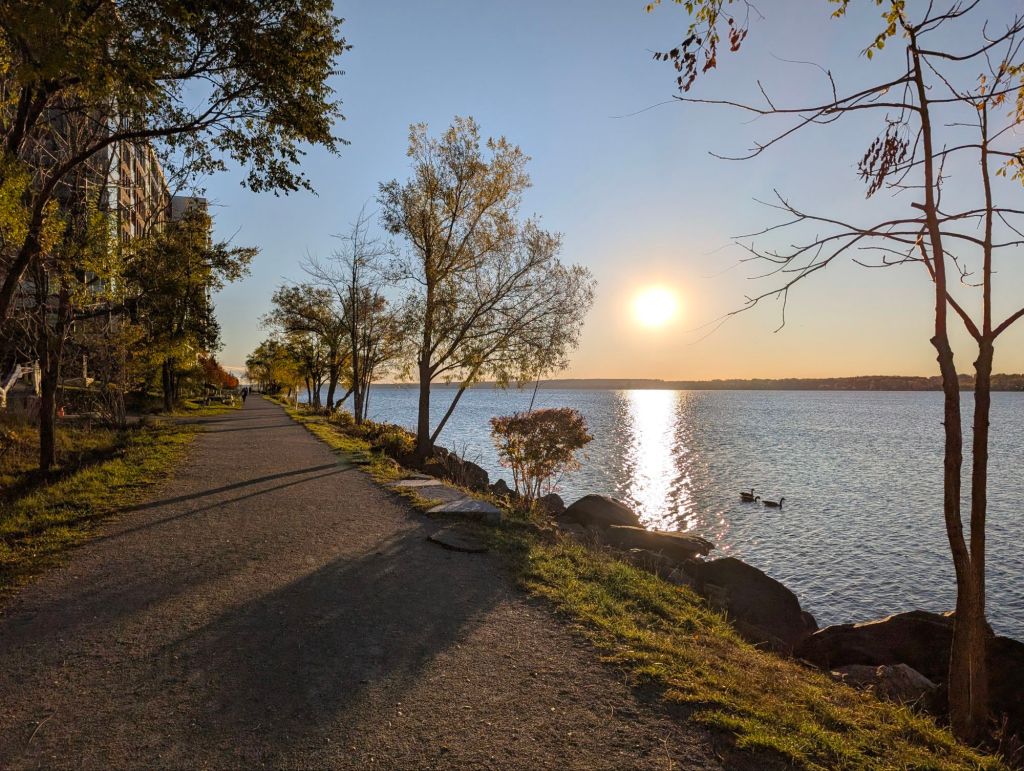 Until this past weekend’s semiannual time change, I was leaving home before Sunrise and returning from work in the evening twilight. now, that is reversed and I’m once again enjoying the Sunrise views over the Bay on my way to work. but either way, the Sun’s always low for me before and after work.