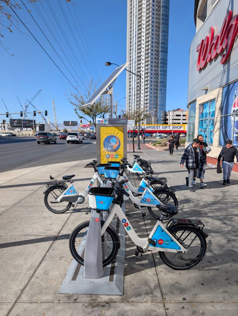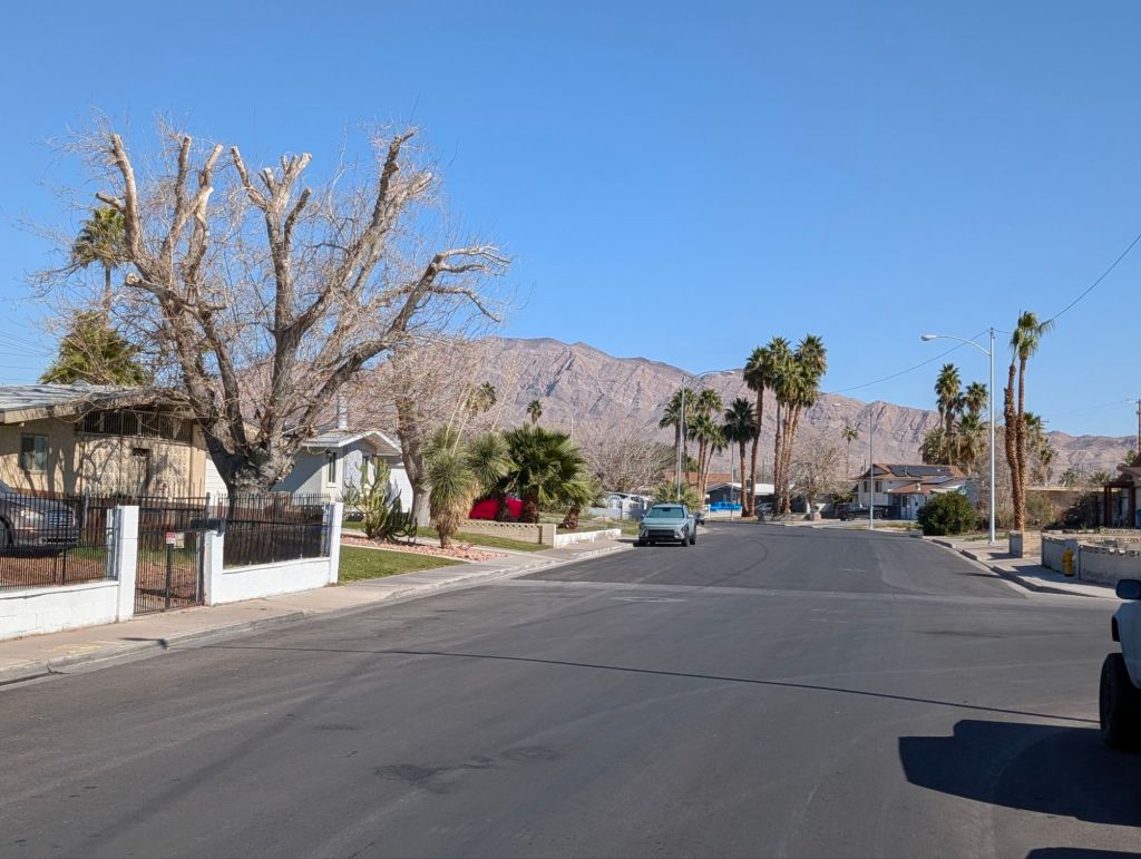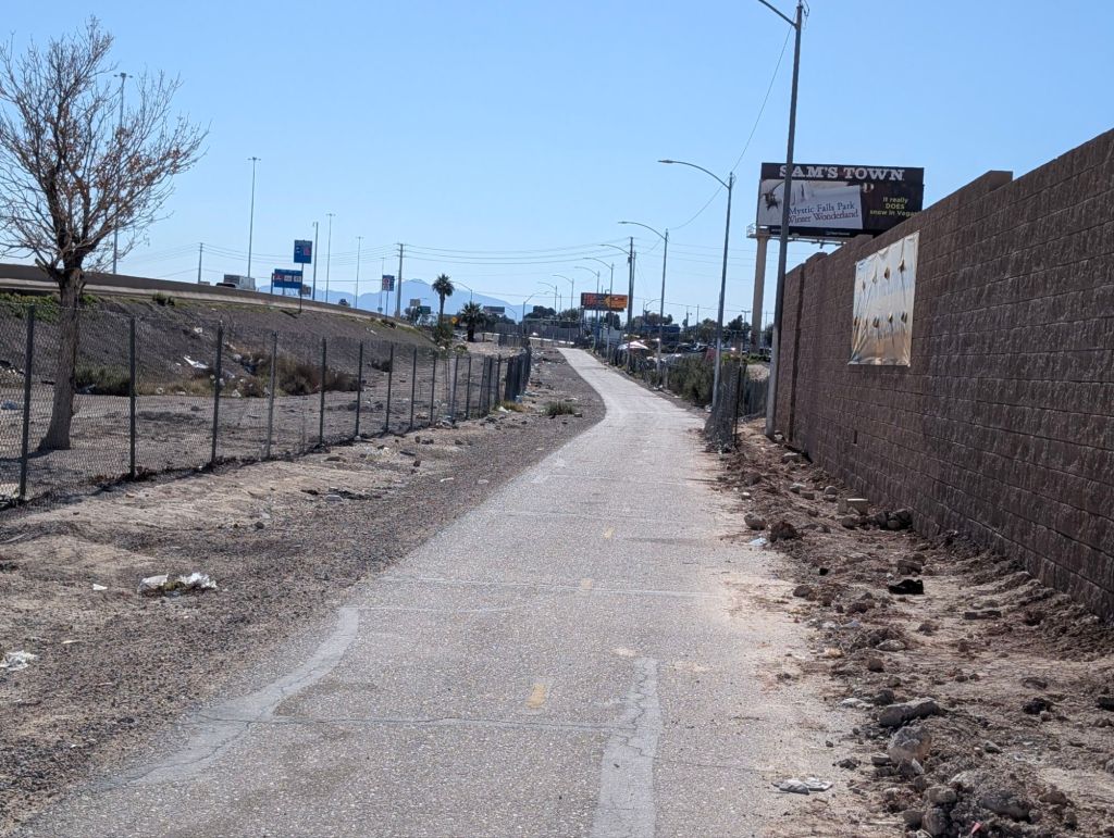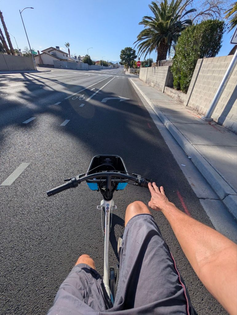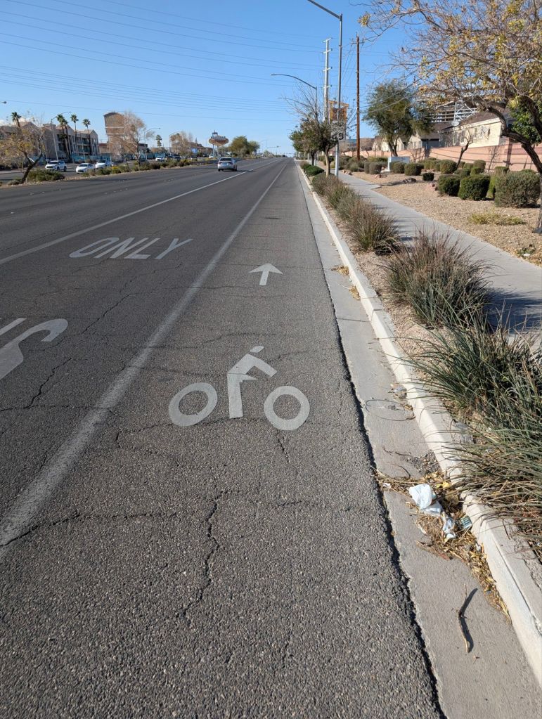 from the perspective of a bicycle rider, the City, although always interesting to explore, leaves much to be desired when travelled on a two-wheeler. I began to pedal Eastward from the Strip, where I had picked a heavy duty city bike off of the bike share rack. I headed to the Flamingo-Arroyo Trailhead on the edge of town, quickly realizing that riding through the City was not going to be fun or easy. although Las Vegas has made some efforts in recent years to accommodate bicycle travel in their road infrastructure, it’s still far too intimate with the overbearing automobile traffic for a rider to feel safe and fully enjoy the ride. bottom line: Car Culture rules supreme here. it’s evident in the often 5+ lane-wide “stroads” with sidewalks right at the curb that some urban designer actually thought was an okay idea. bike lanes that are frequently shared with bus and right turn lanes and traffic that generally speeds by, largely ignoring speed limits. it’s grossly apparent that the locals love big, fast, noisy, shiny and shitbox vehicles. pickups predominate. the bigger, the better. I tried to take refuge in a suburban ‘hood that didn’t offer much reprieve, having extra wide, flat, straight streets that invite drivers to speed through the middle-low class neighborhoods. it’s remarkable how many vehicles are parked on the street & front lawns, after the driveways are filled up. they love their cars. it’s not rare to see a small ramshackle $300,000 bungalow with one or two tricked-out $60,000 luxury model cars parked on the lawn. automobiles are apparently top priority in this culture.